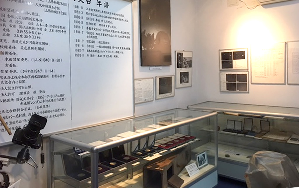 1階は、「本田實記念室」として、本田實が愛用した観測機や星の写真の撮影フィルム、新彗星、新星の発見により贈られたメダル、少年のころ初めて作った小さな望遠鏡のレンズや彗星捜査を決意させた図書などの遺品や写真を展示しています。