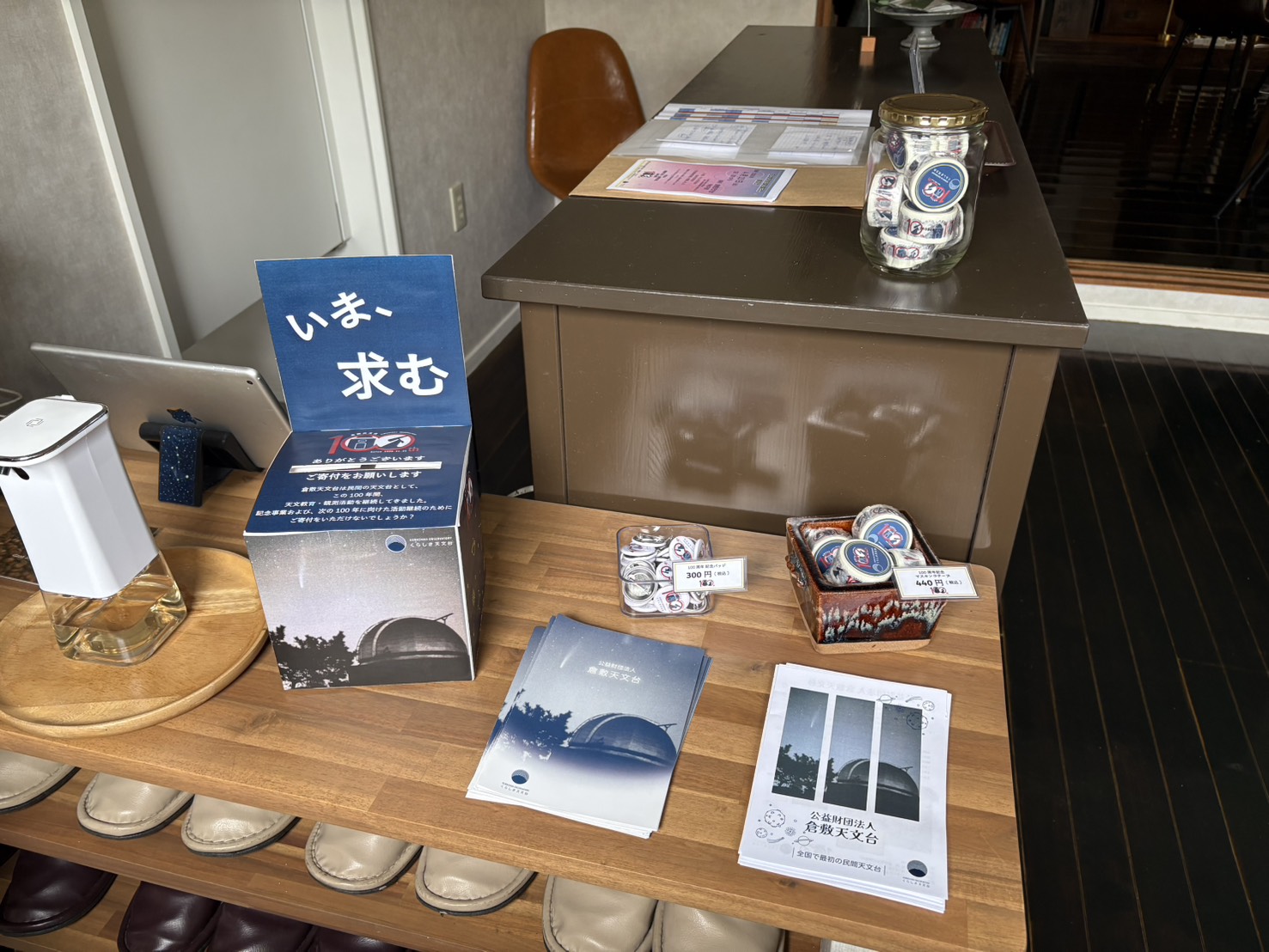 マスキングテープと缶バッチは、天文台のシンボルであるドームや望遠鏡をモチーフにしたロゴが印象的にデザインされています。
